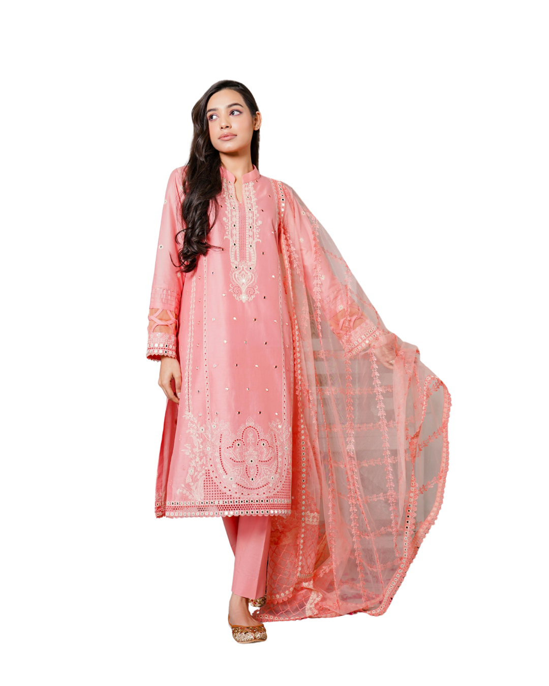 Kameez (tunic): The kameez is a soft pink color, adorned with delicate embroidery in white and silver threadwork. The embroidery decorates the neckline, sleeves, and hem, with small embellishments scattered throughout the fabric. The neckline is a modest band style with buttons down the front.